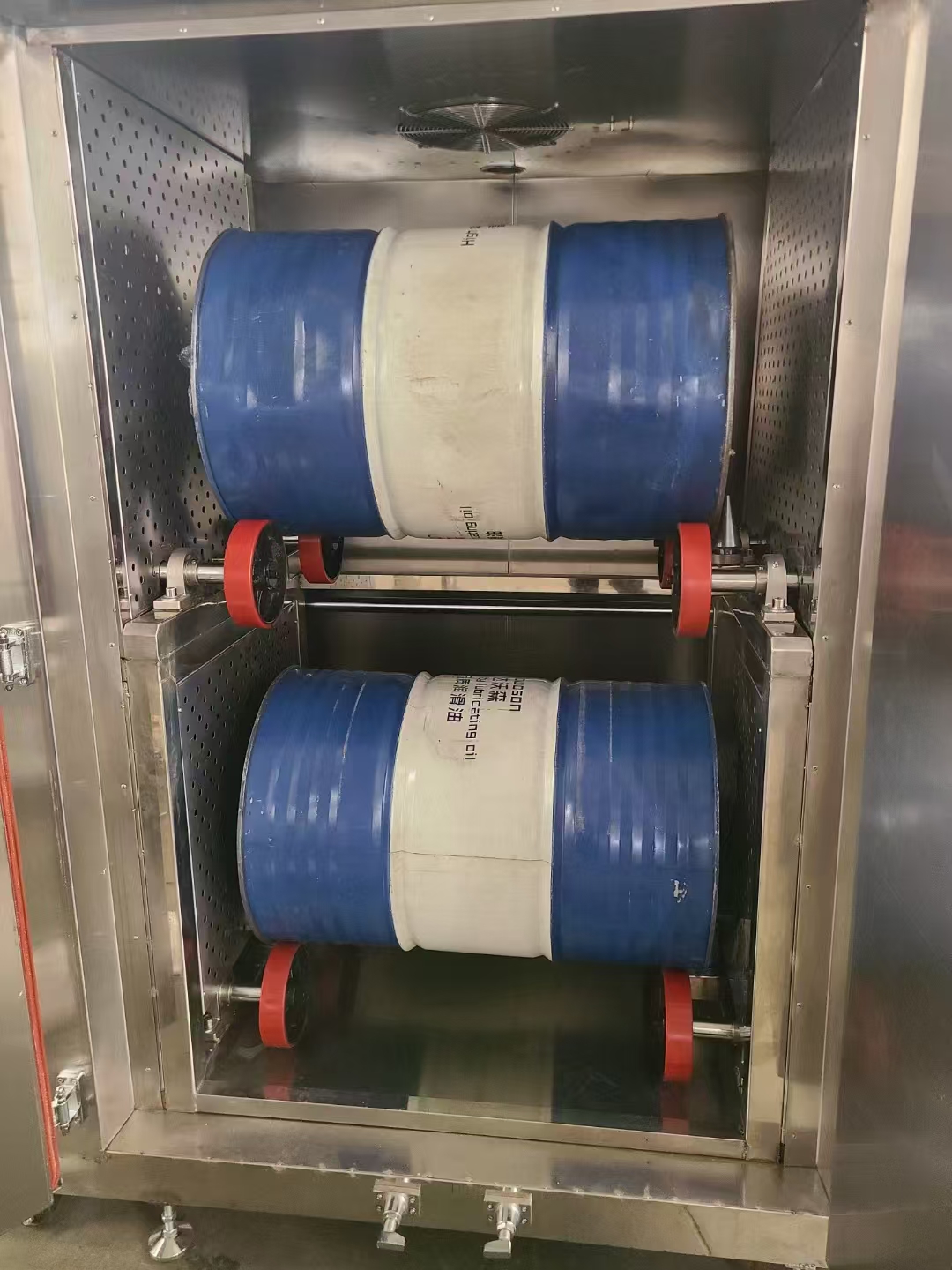 油桶烘箱專為桶料產(chǎn)品設計,在加熱的同時,油桶旋轉,達到快速均勻加熱的目的